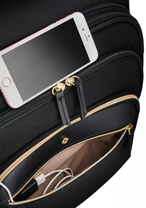 - Exterior: front zippered pocket: perfect for storing smaller items needing quick and easy access, includes an integrated USB Port that provides easy connection to USB accessories (battery/USB accessories not included), Wireless Charging Pocket: located in the middle exterior pocket, this patent pending feature is designed to fit your wireless battery and phone for effortless charging on the go (wireless battery not included)